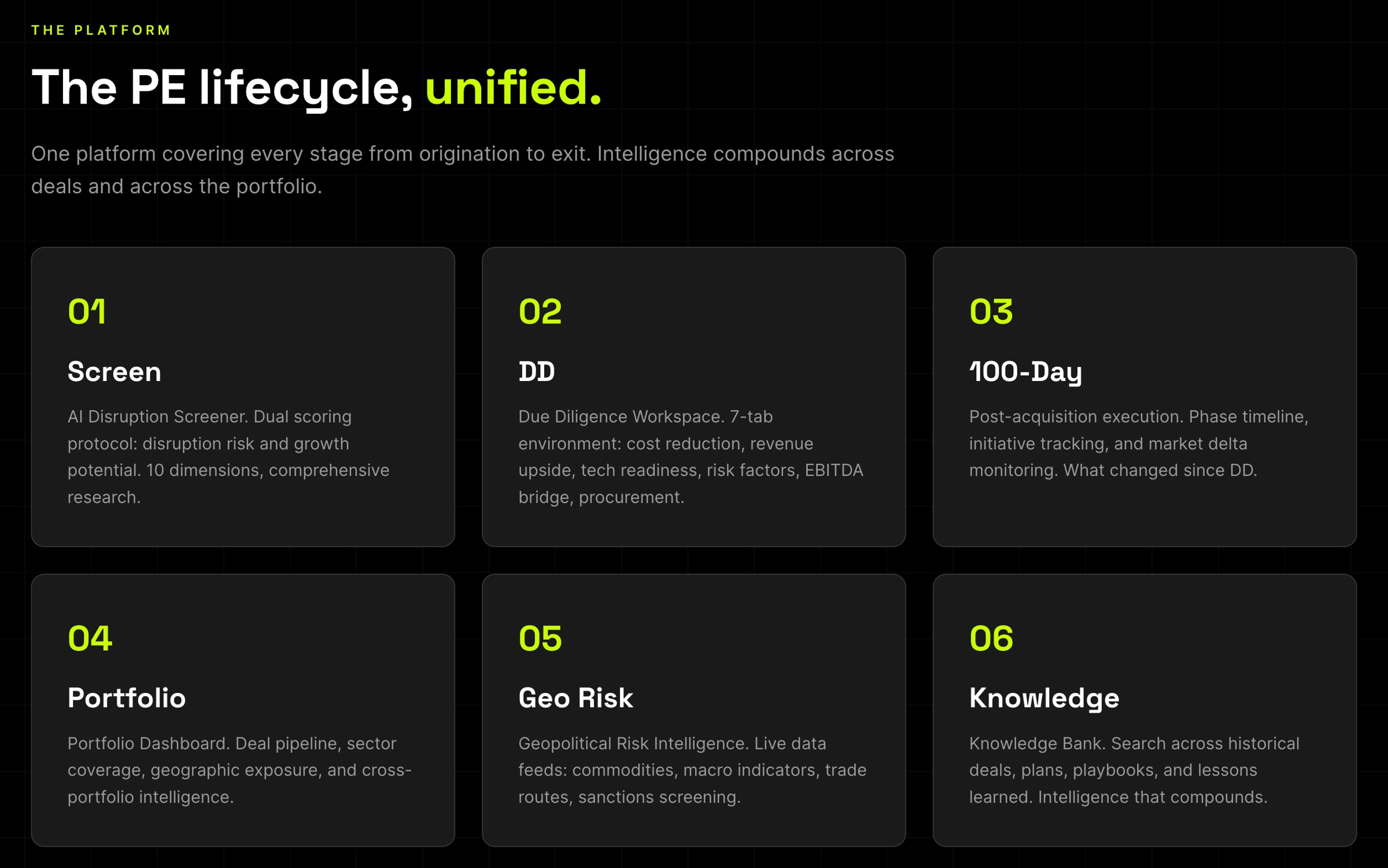 Our PE Intelligence Platform covers every stage from origination to exit. Screening, due diligence, 100-day execution, and portfolio monitoring. Intelligence that compounds across deals and across the portfolio.